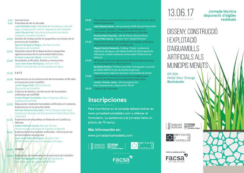 El martes 13 de junio de 2017, José Pablo Gadea, patrono de Fundació Mediambiental de la Comunitat Valenciana y de Fundación Phi, invitado por Facsa, acudió en Benicàssim a las Jornadas de Diseño, Construcción y Explotación de Humedales Artificiales en Pequeños Municipios, con el fin de contrastar experiencias sobre este tipo de instalaciones para el tratamiento de aguas residuales.