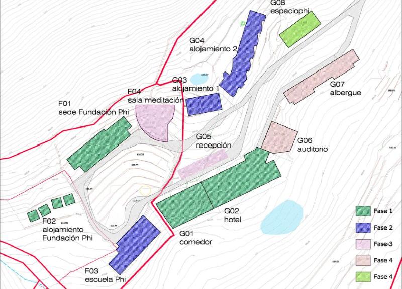 Efectivamente el proyecto requiere de la construcción de distintas edificaciones y equipamientos y hay que destacar la centralidad que tendrá en su ejecución la priorización de un mínimo impacto ambiental y la armonía con el entorno natural en el que estas construcciones se integren. Para ello se ha determinado que el desarrollo del proyecto lo realice Phi Design, estudio de arquitectura participado por Fundación Phi, contando con la colaboración en el mismo del Grupo de Investigación ABIO-UPM de la Universidad Politécnica de Madrid. Dicho grupo está formado por cerca de cuarenta profesionales de distintos ámbitos, desde el paisajismo hasta la arquitectura o el urbanismo, que son líderes y expertos en construcciones sostenibles y bioclimáticas. Así pues la edificación se orientará hacia la armonía con el entorno y el respeto a su realidad preexistente.